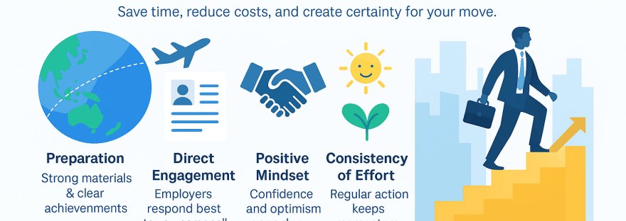 Your biggest lever is to secure work before arrival. This reduces costs, creates certainty, and accelerates your move. That is why our system trains you to present an exceptional profile, communicate effectively, and connect directly with employers — the most powerful way to save time and money.