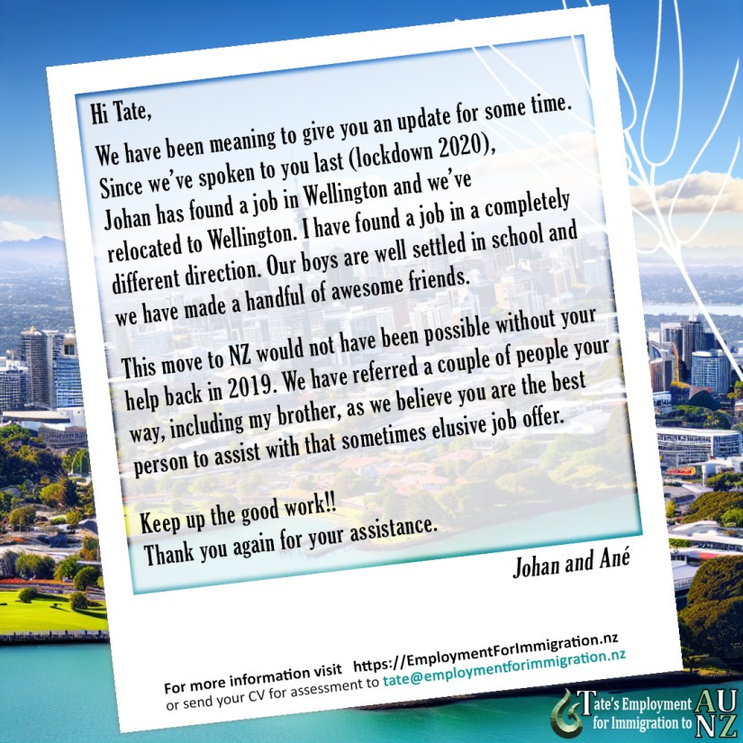 This move to NZ would not have been possible without your help back in 2019. We have referred a couple of people your way, including my brother, as we believe you are the best person to assist with that sometimes elusive job offer.ย Keep up the good work!! Thank you again for your assistance.